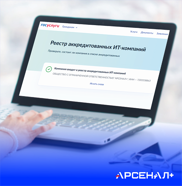 Компания «Арсенал+» в очередной раз подтвердила свой статус аккредитованной ИТ-компании, успешно пройдя ежегодную процедуру в Министерстве цифрового развития, связи и массовых коммуникаций РФ.