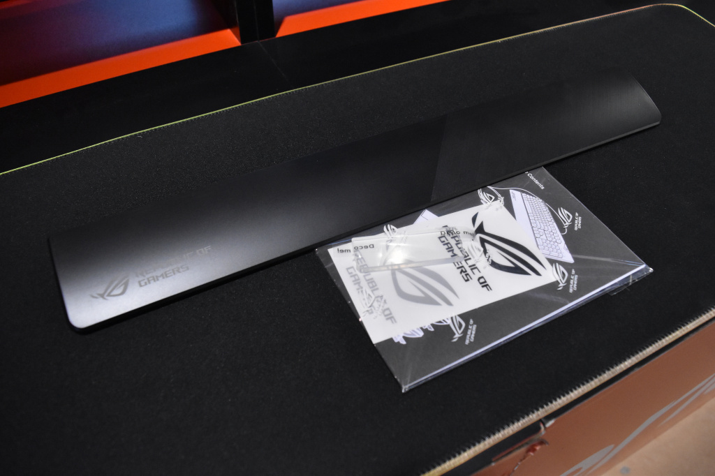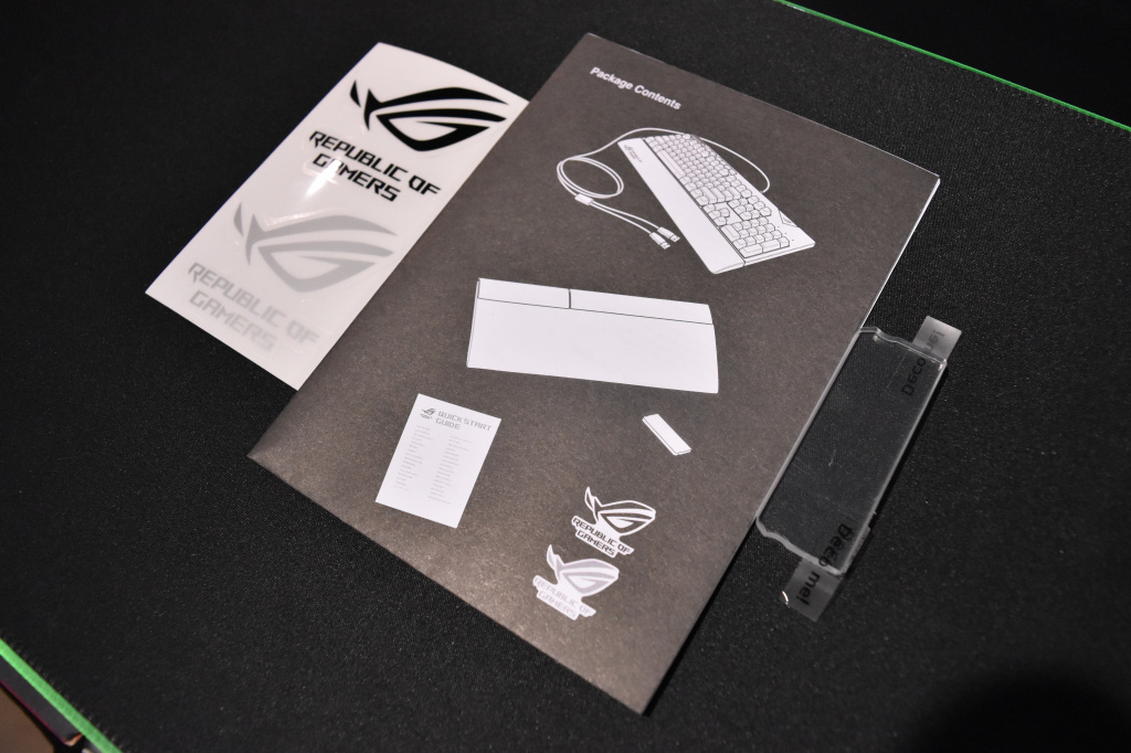 Клавиатура поставляется в крупной картонной упаковке, внутри которой геймера ждет не только сама клавиатура. В комплект поставки входит: инструкция по эксплуатации, подставка для запястий, тканевый чехол для транспортировки, а также сменная прозрачная пластина для нанесения собственного изображения (на пластину, установленную в клавиатуру, производителем уже нанесено изображение логотипа Republic of Gamers).