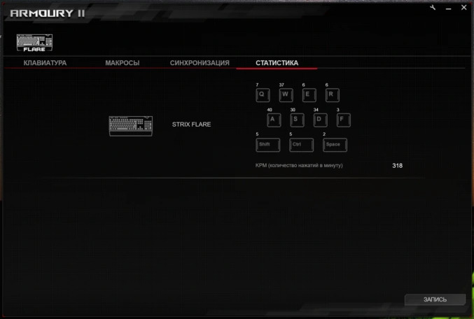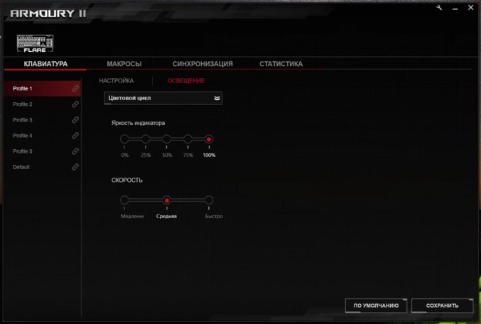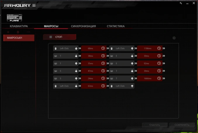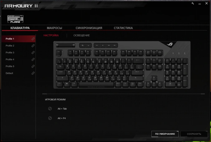 Для тонкой настройки различных параметров Strix Flare предусмотрено фирменное программное обеспечение RoG Armoury II. С ним геймер может полностью кастомизировать клавиатуру. Разумеется, есть настройка RGB-подсветки, создание макросов, переназначение действий клавиш, а также синхронизация подсветки клавиатуры с другими устройствами ASUS AURA, к примеру, с материнской платой или видеокартой. В общем и целом, софт вполне стандартный, а функционал будет знаком многим геймерам, которые ранее пользовались аналогичными утилитами по настройке клавиатур.