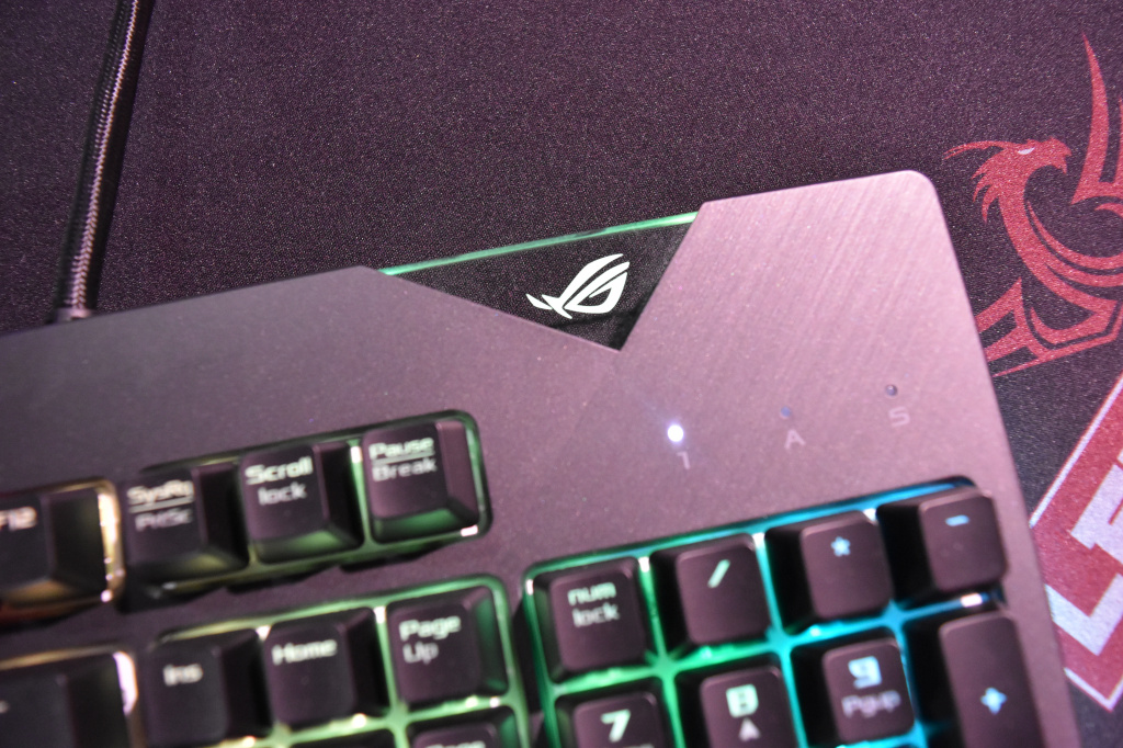 Что касается RGB-подсветки, здесь RoG Strix Flare также преподносит некоторые сюрпризы, хотя, казалось бы, что нового можно придумать там, где это практически невозможно? Как оказалось, можно. В Strix Flare есть две световые полосы, находящиеся по боковым граням клавиатуры. Они являются весомым дополнением к общей подсветке клавиш девайса и определенно придают RoG Strix Flare некий шарм. Подсветка клавиш клавиатуры весьма яркая, а эффектов свечения на выбор – очень много. Отдельно отметим, что здесь производитель решил не удалять ребра жёсткости у колпачков клавиш, которые находятся у кейкапов прямо над светодиодом. Это в свою очередь, имеет свои положительные и отрицательные стороны. К примеру, подсветка не настолько яркая, но в тоже время, колпачки клавиш не снимаются так легко, как в других клавиатурах.