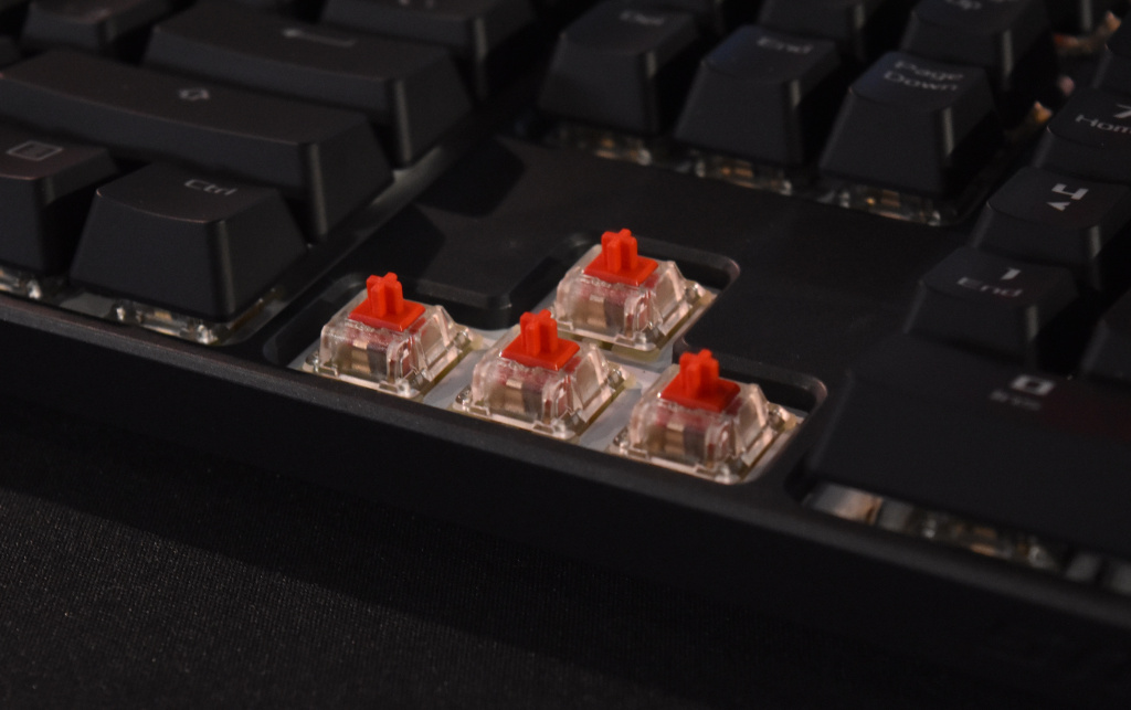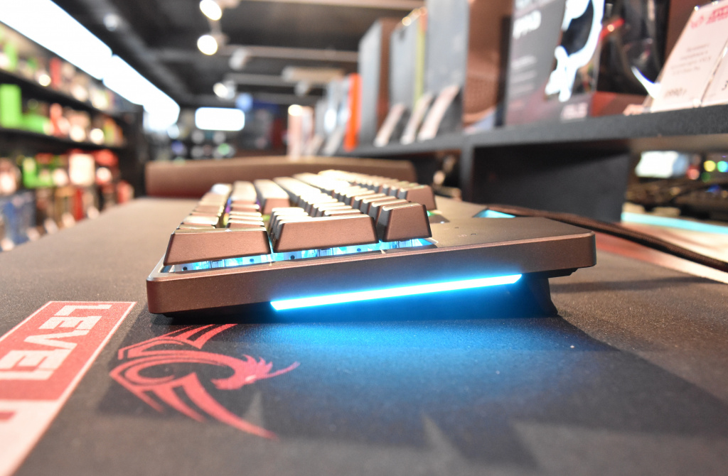 Ближайшими доступными у Strix Flare аналогами переключателей MX Red являются MX Black с той лишь разницей, что в черных свитчах используется достаточно жесткая пружина для быстрого возврата клавиши, поэтому они требуют уже большего усилия для нажатия – 60 грамм. Если же вам больше нравятся щелкающие переключатели, то выбор здесь только один – MX Blue с чуть большей длиной хода до срабатывания и большим усилием нажатия. Свитчи Cherry MX Brown – это золотая середина. По техническим параметрам хода переключателя они идентичны MX Red, но требуемое усилие для нажатия – больше на 10 грамм. «Золотой серединой» их можно считать по той причине, что они имеют тактильную отдачу, но явно выраженного щелчка у них нет.