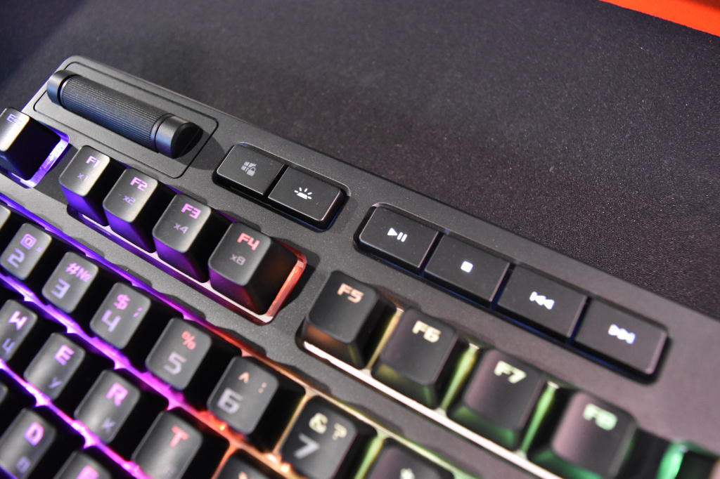 Strix Flare – это достаточно «сдержанная» по дизайну модель, которая не выделяется агрессивным внешним видом, но при этом клавиатура очень стильная. Главная особенность в дизайне Flare – это акриловая светящаяся пластина, которая находится в правой верхней части клавиатуры. Более подробно о ней мы расскажем немного позже. Перед нами полноразмерная модель со 104 основными клавишами, барабаном регулировки громкости, а также шестью дополнительными клавишами, из которых четыре – мультимедийные для управления музыкой и две функциональные клавиши, отвечающие за подсветку и отключение клавиши Windows. Последняя функция - это так называемый «Игровой режим», предотвращающий сворачивание игры при случайных нажатиях на кнопку Windows.