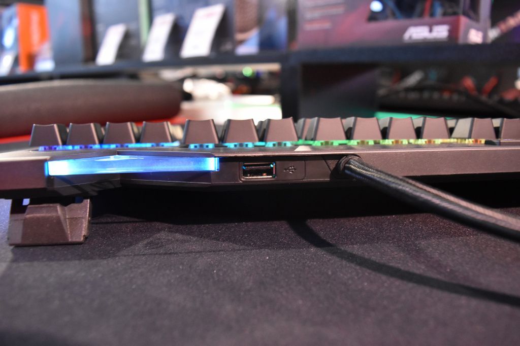 В основе материалов RoG Strix Flare лежит матовый пластик. Пластик – хоть и простой материал, но весьма практичный, особенно, когда он сделан качественно. По дизайну клавиатура выполнена в обычном исполнении, а не в популярном нынче «скелетоне», который можно увидеть чуть ли не в каждой первой клавиатуре на рынке, и который, откровенно говоря, немного приелся. К слову, пару слов о кабеле. Его длина – 1.8 метра, он достаточно плотный и не поворотливый, однако, это объясняется тем, что кабель имеет два USB-разъема, один из которых отвечает непосредственно за работу клавиатуры, а второй – за сквозной USB-порт версии 2.0, расположившийся на вернем торце чуть правее кабеля.