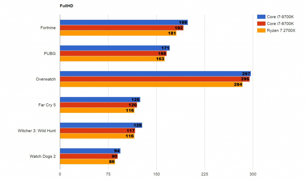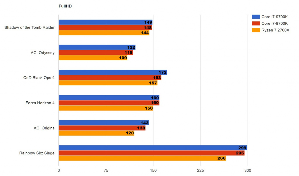 Если судить о новом процессоре Core i7-9700K со стороны производительности, опираясь на результаты тестирования, то разница с моделью прошлого поколения Core i7-8700K заметна лишь на стандартном FullHD и то не во всех тестируемых играх. При более высоких разрешениях обновленный ЦП зачастую либо вообще не показывает прироста, либо показывает, но совсем мизерный, незаметный и не слишком существенный для рядового геймера. Причина в том, что на высоких разрешениях мощность процессора имеет меньшее влияние на производительность в играх, а на видеокарту в свою очередь ложится в разы большая нагрузка. При FullHD ситуация, как видно из результатов, иная.